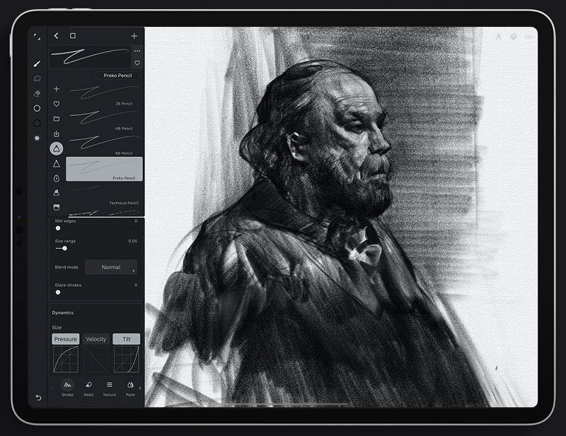 Procreate includes hundred brushes with adjustable settings, consisting of ink, pencils, charcoals, etc. Even better, if you can't find the brush you need, you can simply create your own or import brushes from other creative professionals.